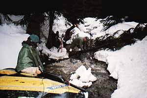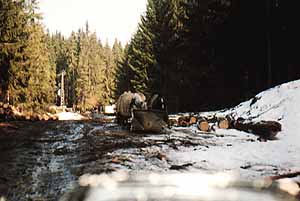 Ráno už nám nepřálo ani počasí , ale přesto jsme se s elánem, pustili vyzbrojeni sekerou , ruční pilou a lopatami na odhazování sněhu do potoka.Dlouhých 1.800 m které nás dělily od cesty vedoucí do údolí jsme zdolávali 6 hodin , po nekonečném přeřezávání padlých stromů praskl list pily , ale po improvizované opravě jsme pokračovali dál , naviják stahoval klády a naše zmrzlé ruce odvalovaly do nekonečna kameny , ovšem po zdolání potoka jsme se všichni shodli, že vlastně celá cesta byla to pravé a zapomněli jsme rázem na nesnáze které nás provázeli . Ve tři hodiny odpoledne jsme byli na dobré lesní cestě, po které jsme pokračovali noční jízdou podle řeky Moldavy .Pak jsme jeli do jedné v noci po místní okresce, která spíše připomíná širokou polní cestu plnou děr a výmolů , až na místo posledního přenocování .