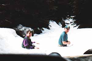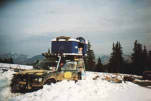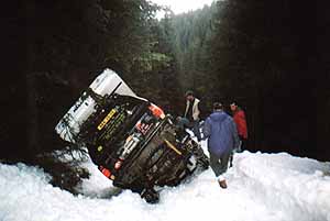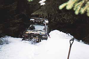 Je ráno a počasí opět nezklamalo , zbývá posledních patnáct metrů proházet 2 m širokou cestu pro naše vozy. Úzká lesní cesta je poměrně dobře sjízdná a menší závěje překonáváme systémem zpátečka , malá za tři a plný plyn pak následuje gejzír sněhu a prorážení závěje. V tom horším případě, kdy jsme závěj špatně odhadli, následuje posazení vozu na břicho a nepříjemná práce s hliníkovou lopatou tak 25 minut, než se podaří vůz podhrabat a uvolnit ze sněhového zajetí , což nás čekalo dopoledne asi šestkrát . Na oběd není čas a tak pokračujeme poměrně dlouhým úsekem 2 km bez větších komplikací , ty přicházejí v podobě levotočivého stoupaní, zcela zledovatělé lesní cesty, na které se dá těžko udržet na nohou . Zkoušíme to krokem vpřed ,ale zadní část vozu nebezpečně ujíždí dolů, kde je zhruba 6m vysoký ostrý schod dolů a pak les. Přichází ke slovu naviják , kladka a kurty, které nám pomohou postupně po 3 hodinovém snažení přetahat naše vozy .Po dalších 3 km celkem plynulé jízdy se otvírá paseka , která vypadá téměř bez sněhu . Naše radost končí ihned po přejetí brodu na severní část paseky - zase závěje a na výběr dvě cesty, my volíme cestu více vpravo , na které nás čeká 50 m proházet k ústí do lesa , kde už je cesta sjízdná a hlavně vede kolem salaše , kterou využijeme pro dnešní přenocování .