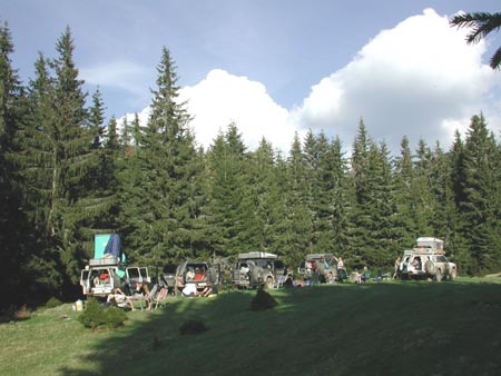 23.5.2002, 15 h - dnes od rána azurové nebe, jedeme směr "můj tábor" 1656 m n.m. Přestože je terén stále podmáčený, nenecháváme si ujít zdejší úvozy - je to paráda. Končíme na hřebenu ve výšce 1657 m na místě, jenž se zove můj kemp".